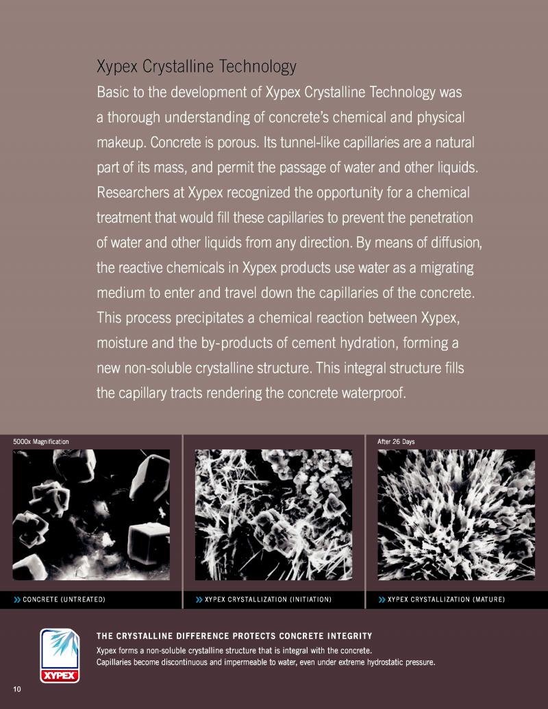 In brief, Xypex is a cementitious powder product, based upon concrete technology, that covers concrete waterproofing, concrete repair, and concrete protection as a 3-in-1 system. Its cystalline growth penetrates deep into the concrete matrix and becomes an integral part of the concrete itself. Xypex crystal is inorganic and also, a catalyst. It reacts to the by-products of the cement hydration and moisture inside the concrete to form an insoluble crystalline structure deep within the capillary tracts of the concrete. Therefore, it is more resistance to extreme hydrostatic pressure from all directions and it will remian inside the concrete throughout the life of the concrete. Once the concrete develops micro-cracks from future shrinkage or movement, Xypex crystals will reactivate upon contact with the new moisture to reseal micro-cracks up to 0.8mm wide (0.4mm from both sides of the crack surface). This unique feature alone has been proven over extensive testing by many reputable laboratories and is unmatched by any other products claiming to be the same.